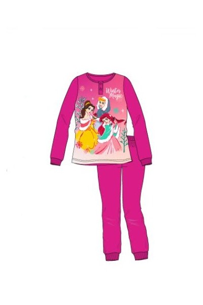 Pijama infantil para niña en interlock. Camiseta de manga larga con cuello tapeta y puños. Estampado "Pricesas" con texto "Winter Magic". Pantalón largo liso con puños. Presentación en caja Personalizada. 100% Algodón