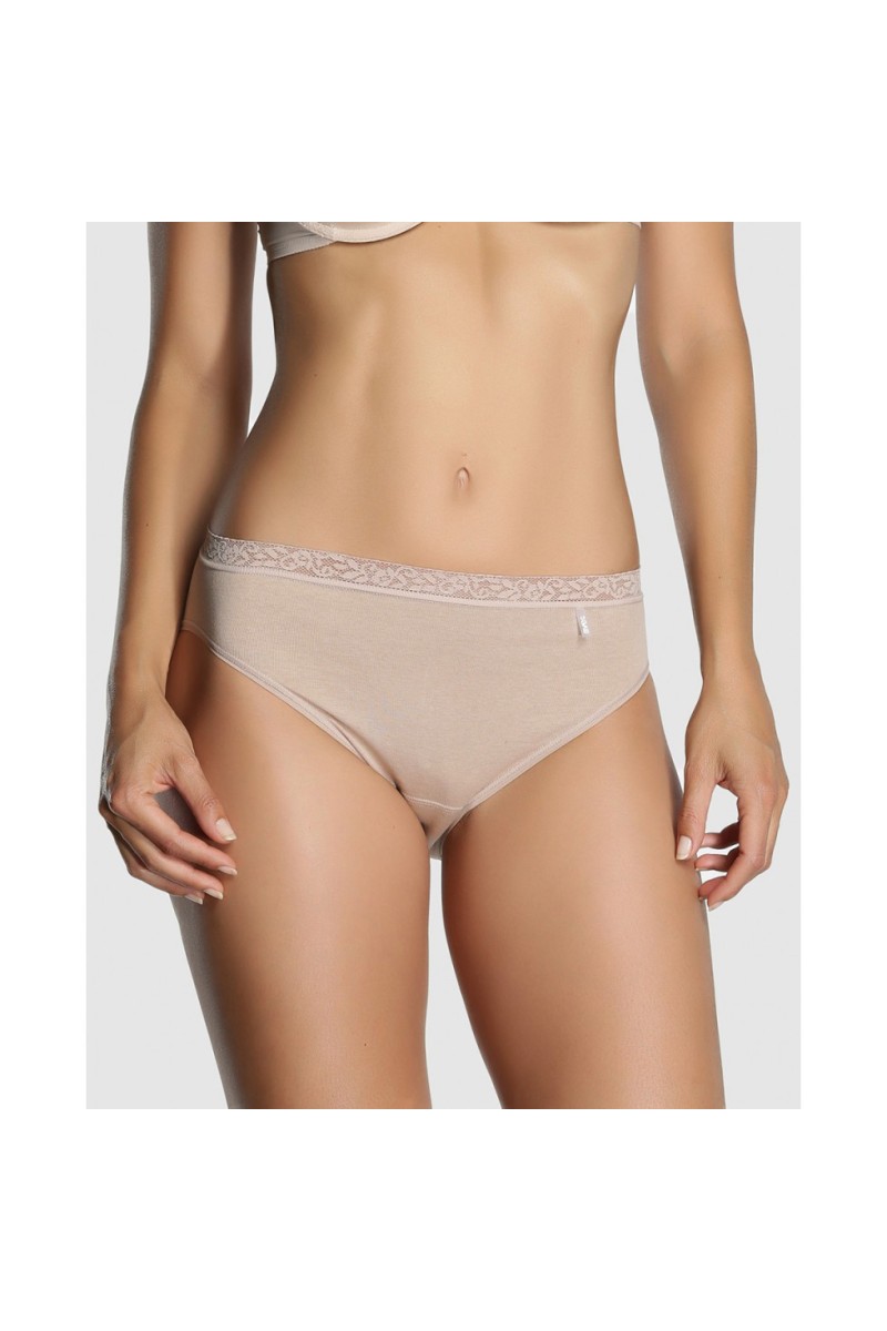 Braguita midi de algodón sin costuras laterales, proporcionando así un mayor confort. Acabado de encaje en la cintura, muy suave a la piel. Diseñada y fabricada en España.